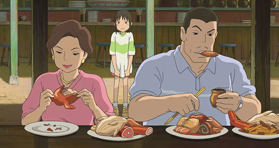 影片的开端,千寻一家正行驶在迁往新家的路上。由于迷路,千寻跟随好奇的父母走进了一条隧道,进入了灵异小镇。隧道是现实世界和想象世界的过渡地带,通过隧道,他们从人类世界进入了神灵的世界,后来又再次回到人类世界。进入灵异镇后,千寻的父母禁不起美食的诱惑,未得允许便在一家无人店里大快朵颐,后来变成了两头肥猪。食物的象征意义是人类世界中各种诱惑,财富、权力、地位……为了这些,人类抱有侥幸心理,甘愿冒险尝试,一旦开始便成瘾似的不能中断。千寻和白龙站在猪圈前。千寻问:“他们病了?还是受伤了?”白龙答:“不是,是吃太饱了在睡觉,他们已经忘记自己是人类了。”